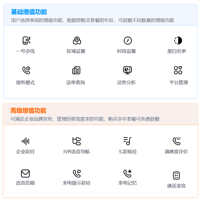 互亿无线400电话平台提供丰富的增值功能,根据选择套餐年份的不同,可获赠不同数量的增值功能。点击查看400电话增值功能详情