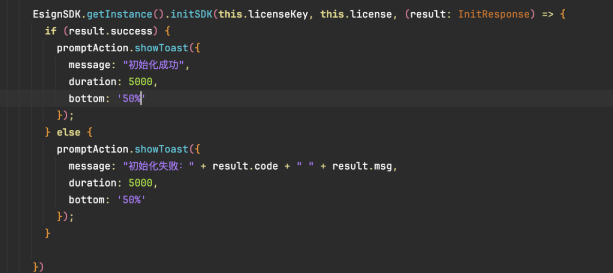 EsignSDK.getInstance().initSDK(licenseKey, license, (result: InitResponse) => { })