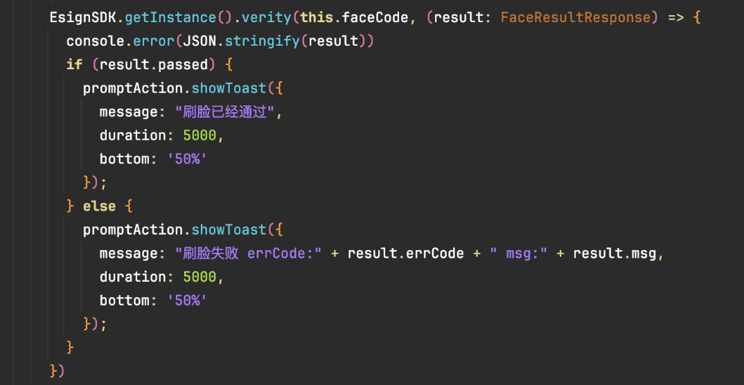EsignSDK.getInstance().verity(faceAuthCode, (result: FaceResultResponse) => {})