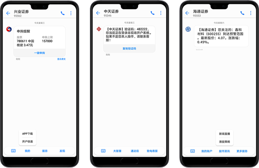 目前,智慧短信已与众多证券企业开展深度合作,在证券行业累积丰富的智慧短信服务经验,为他们提供全新的智慧化服务和场景化便捷服务,帮助证券解决拓客效率低和成本高、业务信息和资讯难以及时触达客户等难题。