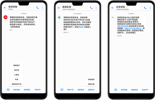 目前,智慧短信已与众多保险企业开展深度合作,在保险行业累积丰富的智慧短信服务经验,为他们提供全新的智慧化服务和场景化便捷服务,帮助保险解决拓客效率低和成本高、保险续保不便捷,保险产品信息和资讯难以及时触达客户等难题。