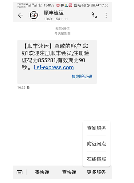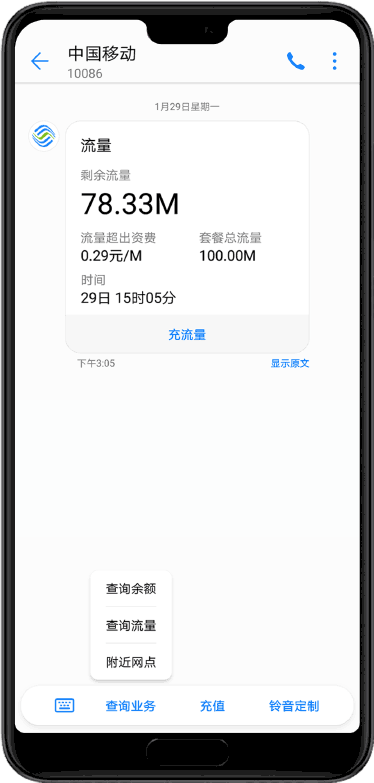 全面展示企业服务交互、业务办理信息,点击短信下方的菜单,便可跳转H5链接或打开APP应用