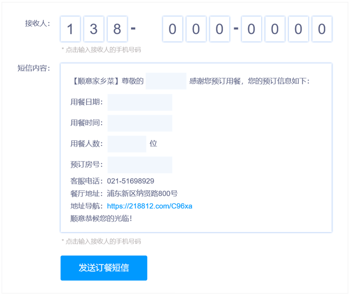 用户通过网络、电话订餐后,餐厅通过短信的方式将预定信息以短信的方式推送给客户,可实现客户对信息的确认及提醒。