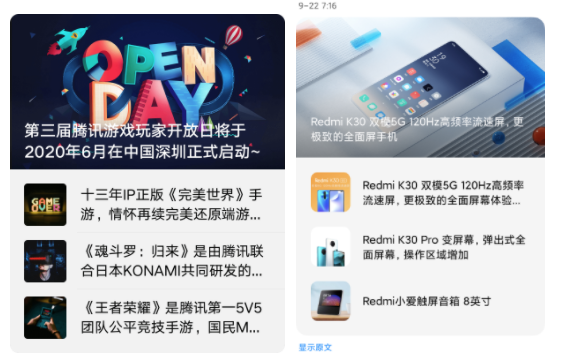 由图片、文本组成的模板样式,适用于文章发布、新闻资讯等场景。文章条数可以2条、3条、4条。目前华为、小米、oppo、 vivo、 魅族的手机终端支持该模板