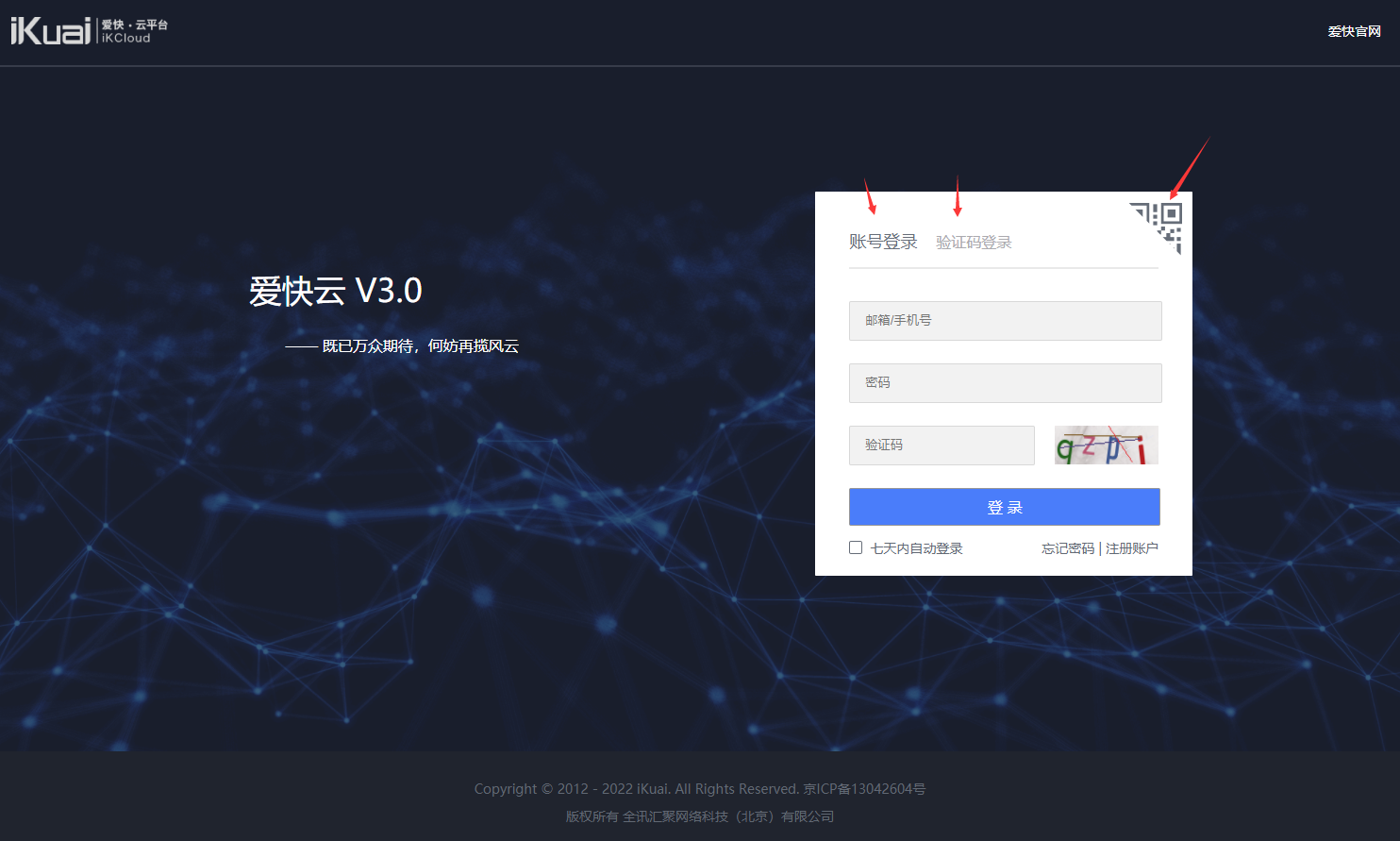 3、如果您已有爱快云平台的账号,可以通过账号密码、短信验证码或者扫码(使用"爱快e云"APP或"爱快微云"微信小程序)登录