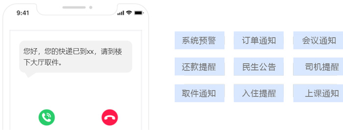 在语音短信群发实际使用场景中,语音呼叫虽然具有强提醒特性,能确保用户注意到信息,但是用户不一定能记住信息内容,针对这种情况,互亿无线语音通知接口整合了同步推送短信通知的功能,用户在收到电话语音通知的同时,能同时收到相同或指定内容的短信通知,确保用户既能注意到重要信息,又能看到重要信息的内容。