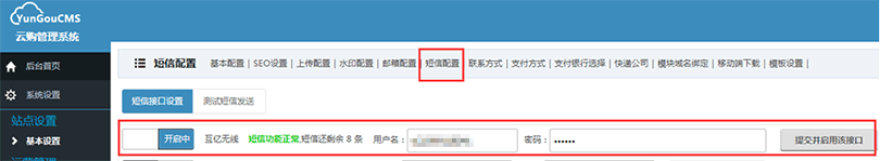 选择 互亿无线 短信接口,输入您的短信用户名与密码,点击 提交并启用该接口 按钮,如用户名密码填写正确的话,该处会显示您的短信余额。