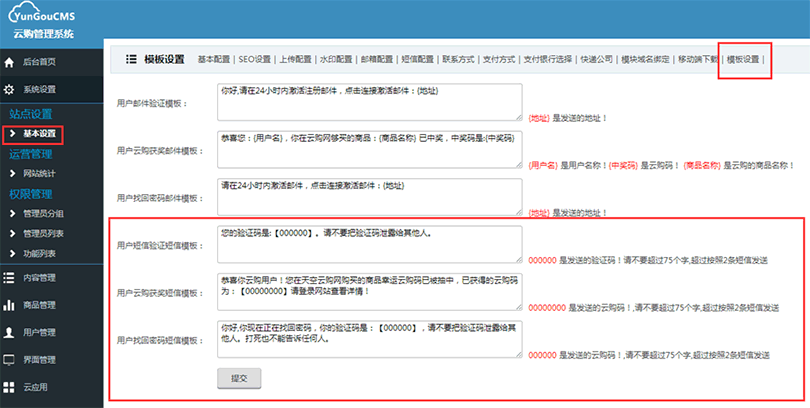 系统已经预置了这几个默认的短信模板,无需报备即可直接使用;如您要修改模板的内容,请同时登录互亿无线平台报备新的模板。