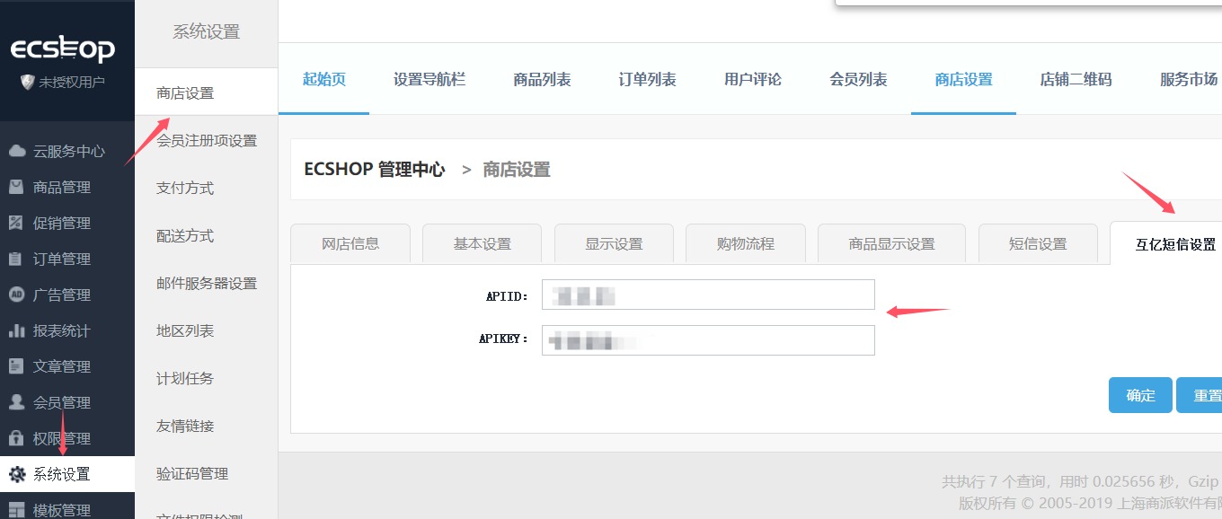 2、进入管理后台-》商店设置-》系统设置-》互亿短信设置-》填入互亿的帐号和密码。
