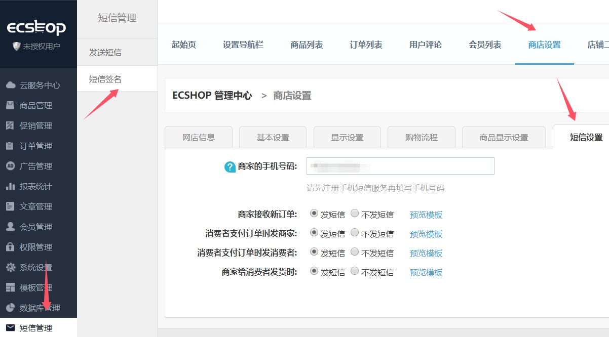 3、进入管理后台-》商店设置-》短信管理-》短信设置-》填写商家的手机号,开启短信功能。
