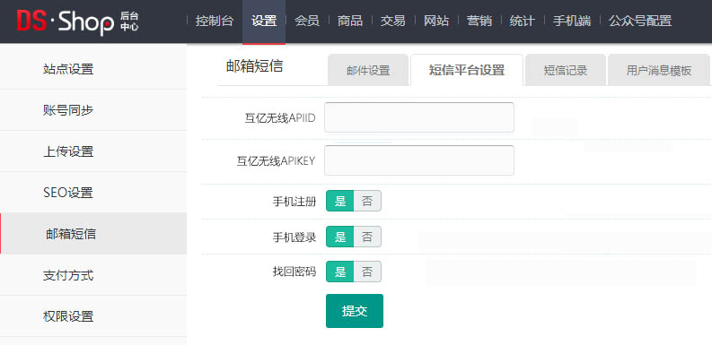 3、使用管理员账号登录系统后台,依次进入【设置】→【邮箱短信】→【短信平台设置】页面,服务商选择「互亿无线」,填写互亿无线 APIID、APIKEY,配置完成后点击「立即保存」。