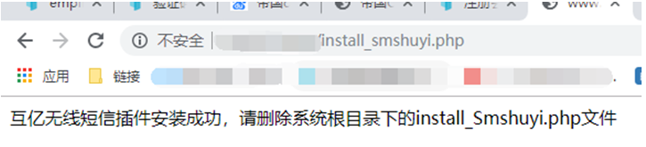 2:将互亿无线插件解压至根目录覆盖,浏览器输入:域名/install_smshuyi.php安装互亿无线短信插件,出现安装成功提示后请将根目录下的install_smshuyi.php删除。