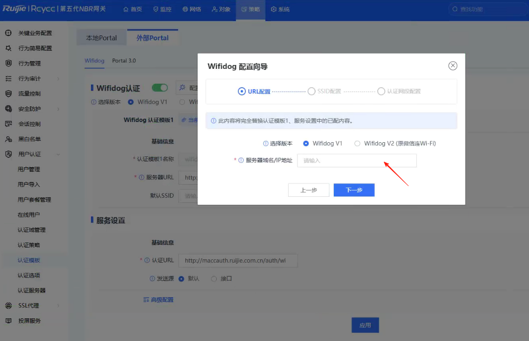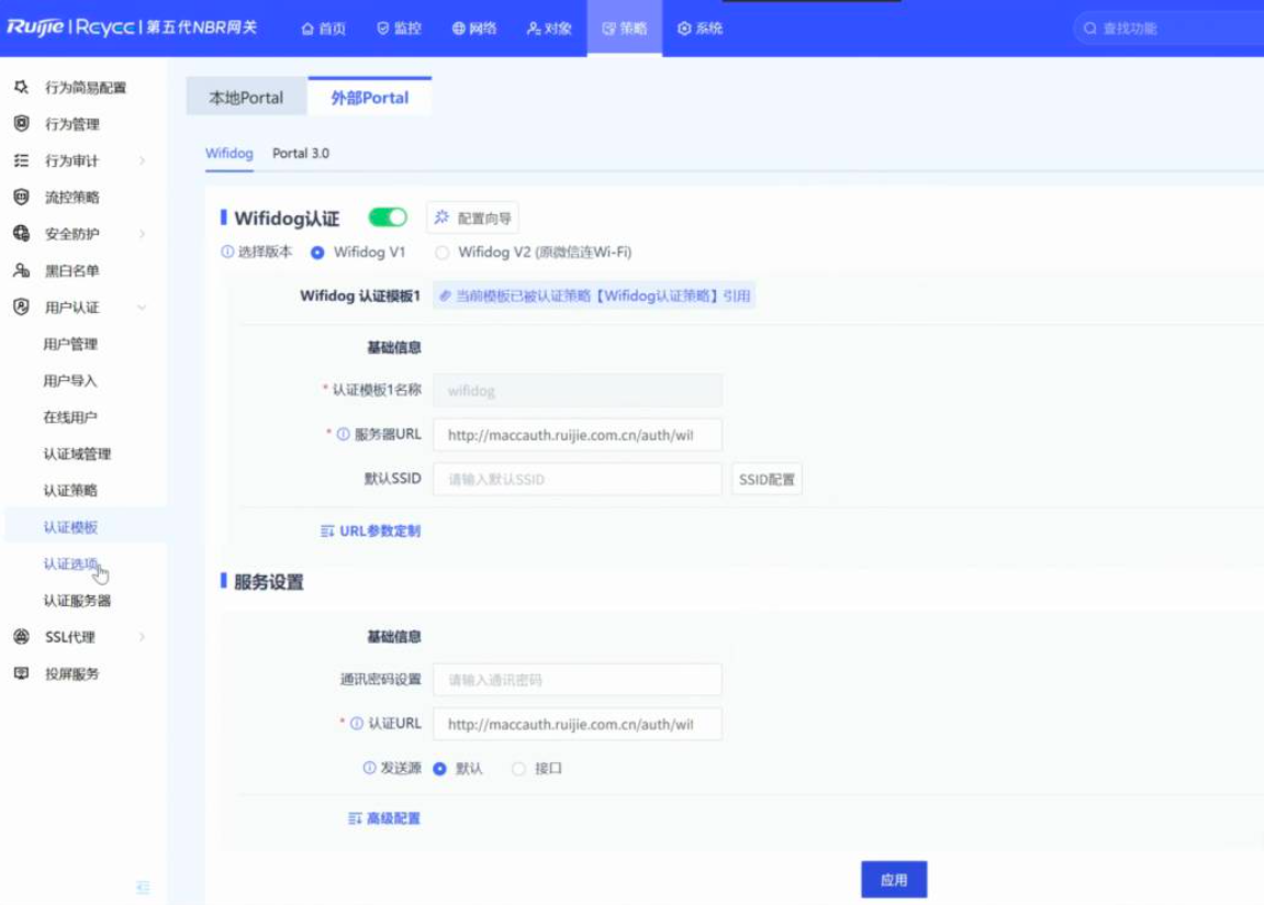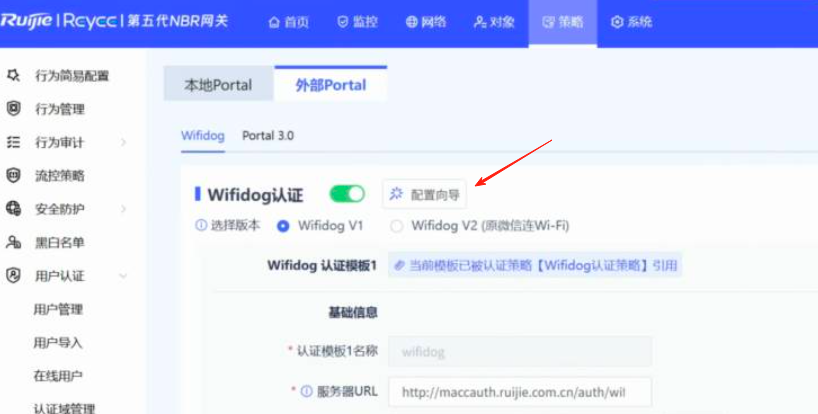 1、点击顶部菜单中的【用户认证 - 策略】,然后再点击左侧的【认证选项】,再切换至【外部Protal】标签。