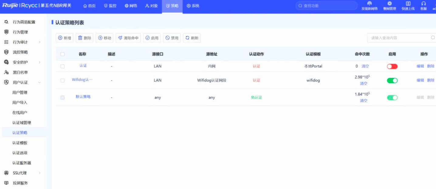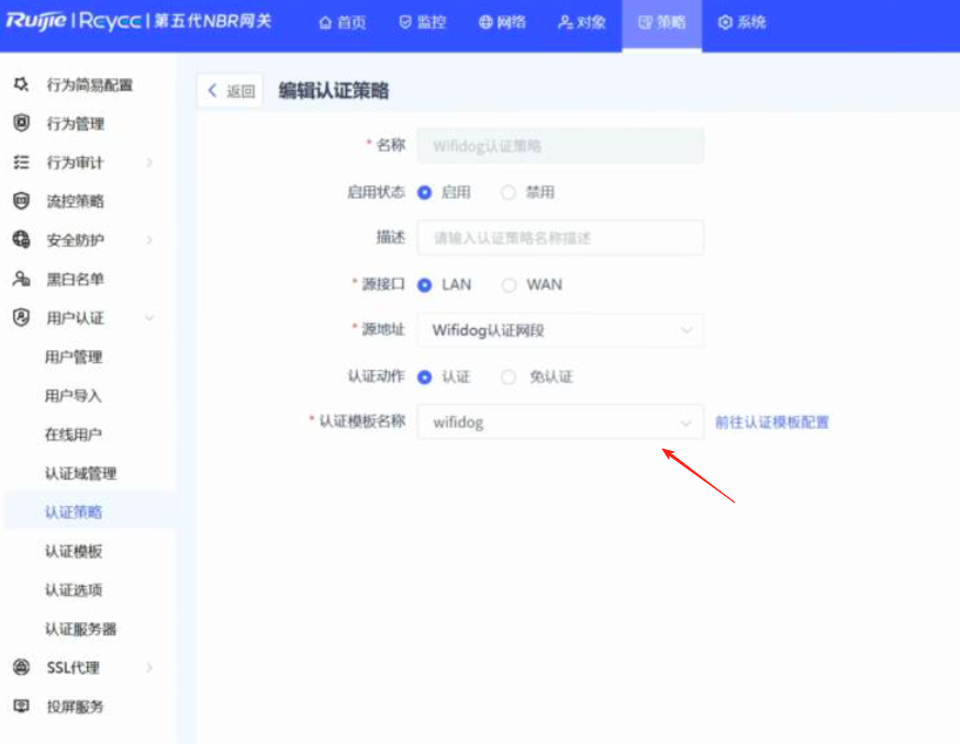 4、点击左侧菜单【用户认证 - 认证策略】,编辑“wifidog认证策略”,并确保该策略是启用状态。