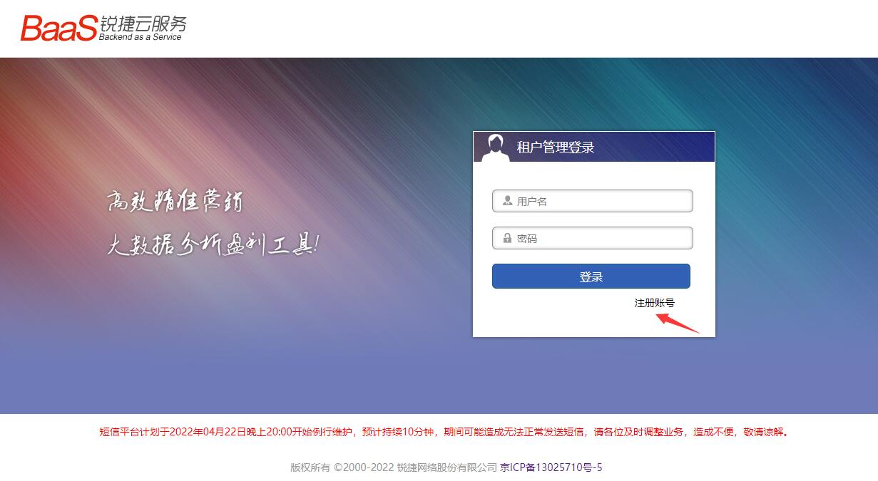 1、访问BasS锐捷云平台:https://baas.rj.link/,点击页面上【注册账号】按钮,进入baas账号申请页面。