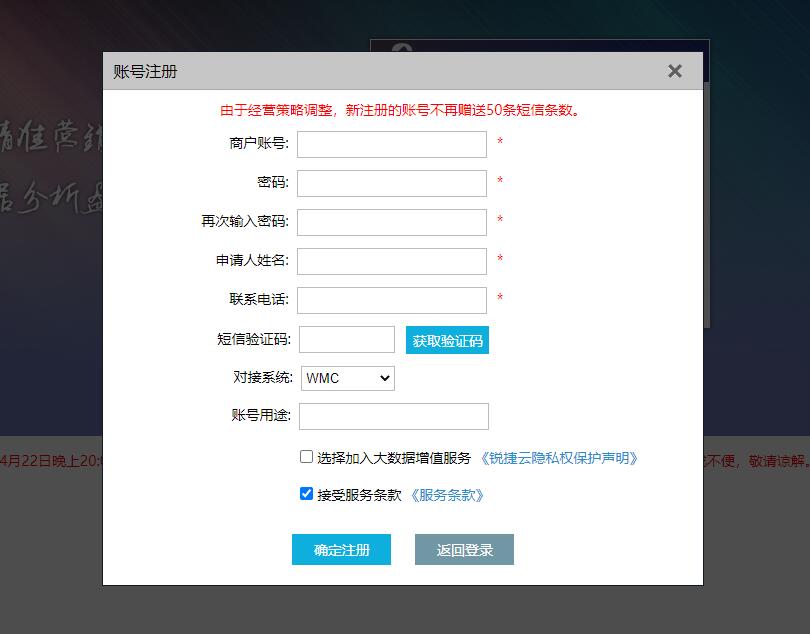 2、填写商户账号、密码、联系电话等信息(“对接系统”如不清楚,则选其他),正确填写信息过后,点击【确定注册】按钮。
