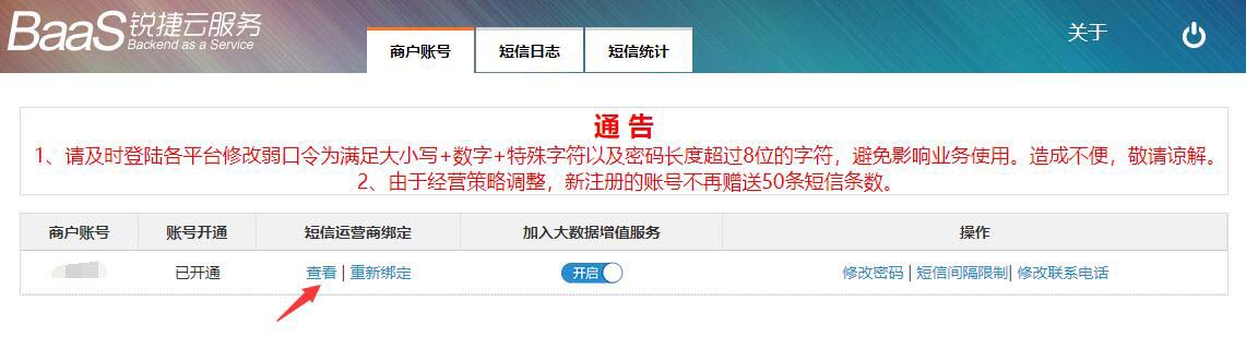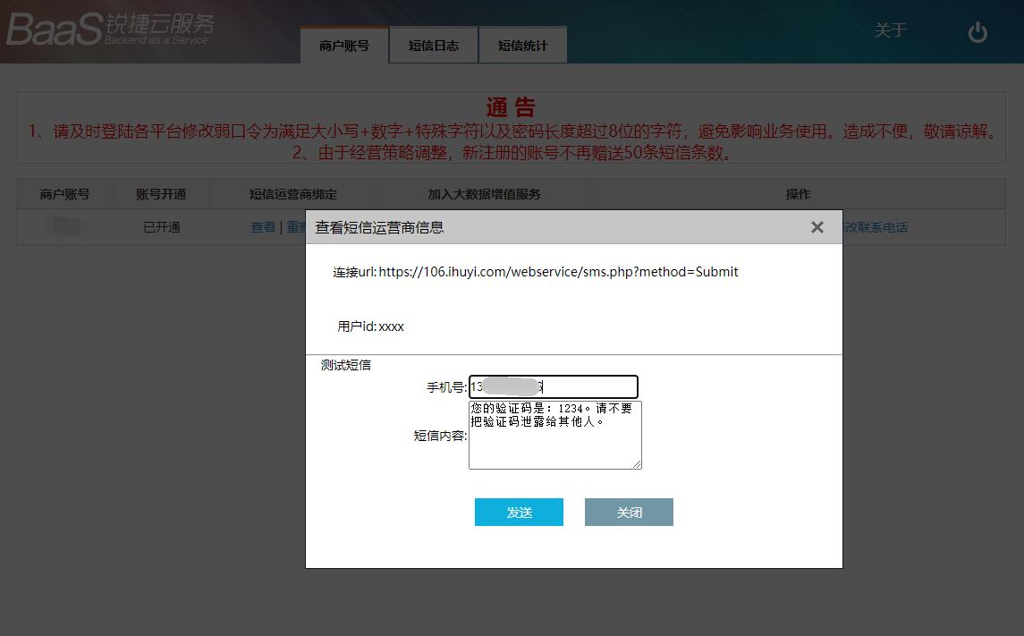 注:请先填写上述短信内容进行测试,调试成功后可以更换其他短信内容,使用新短信内容需在互亿无线短信平台进行模板报备。
