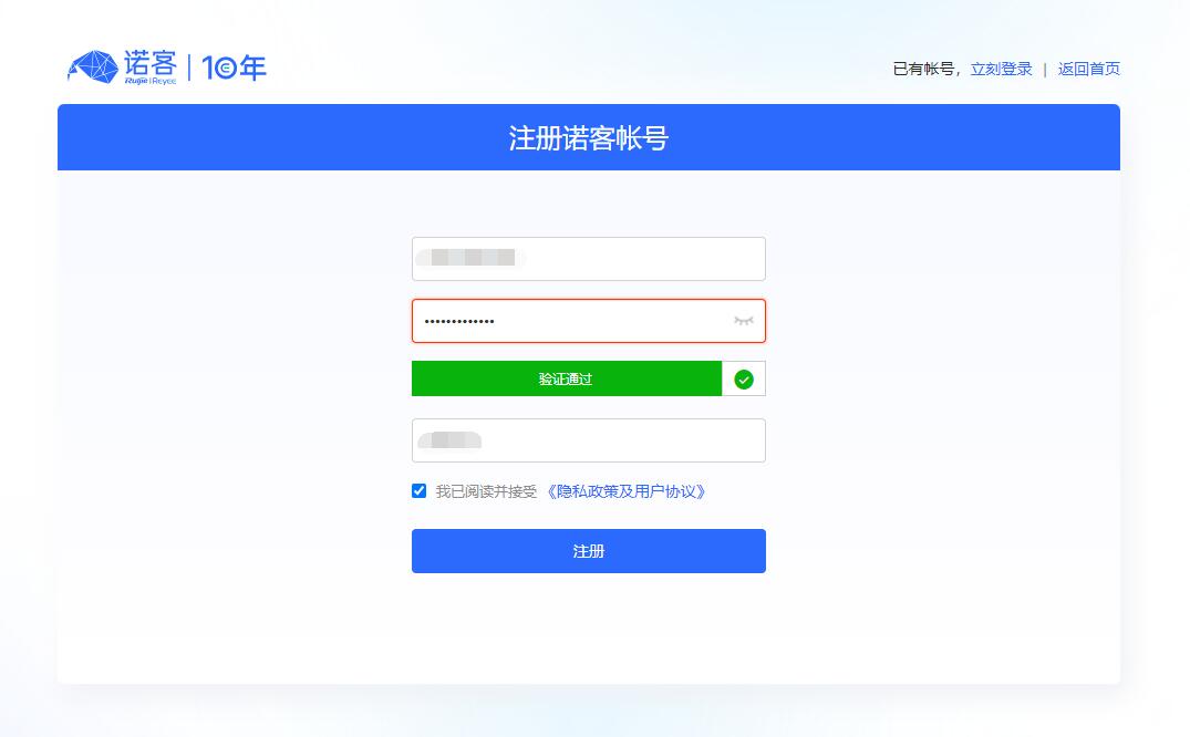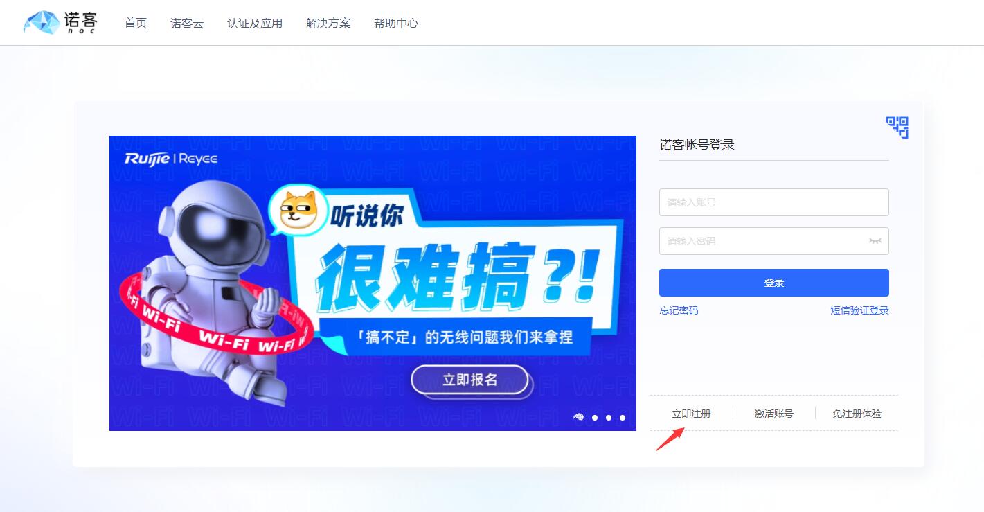 1、登录RG-MACC诺客云平台:https://noc.ruijie.com.cn/sso/login,点击【立即注册】按钮。