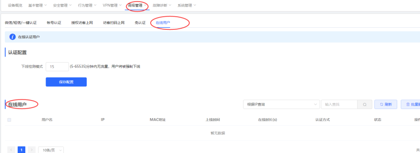 下线检测:终端在一定时间内的流量小于设定值时将被设备下线。