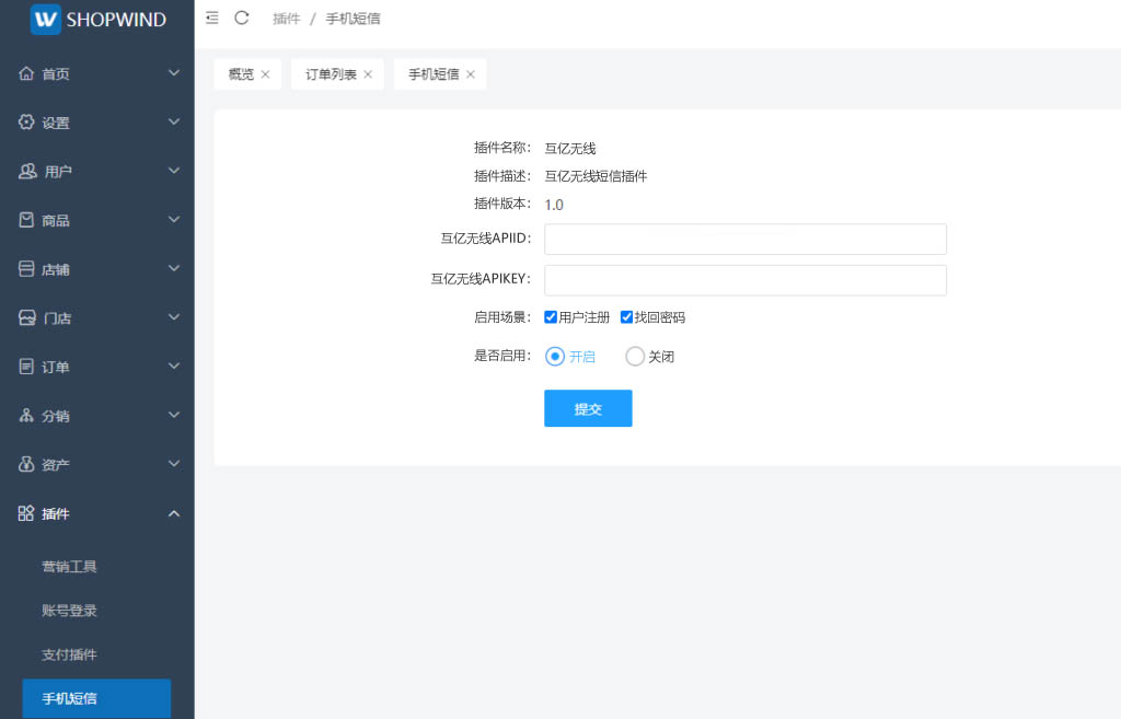 2、使用管理员账号登录系统后台,依次进入【插件】→【手机短信】,安装互亿无线短信插件并完成相关参数配置,配置完毕后保存设置。