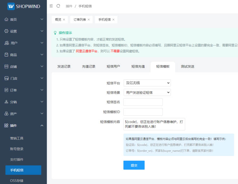 本插件系互亿无线针对ShopWind v5.0商城系统短信插件,插件内的文件有对原文件的修改,如果您的系统经过二次开发,安装本插件之前,请仔细核对修改。