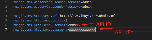 ruijie.sms.http.send.username=改为互亿无线的APP ID(获取方式见下文)