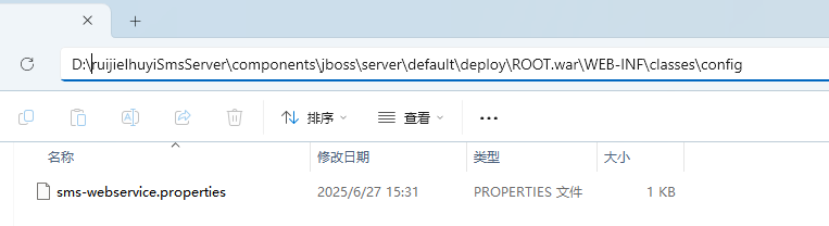 2、访问解压后的文件夹,访问文件路径:ruijieIhuyiSmsServercomponentsjbossserverdefaultdeployROOT.warWEB-INFclassesconfig,打开文件:sms-webservice.properties