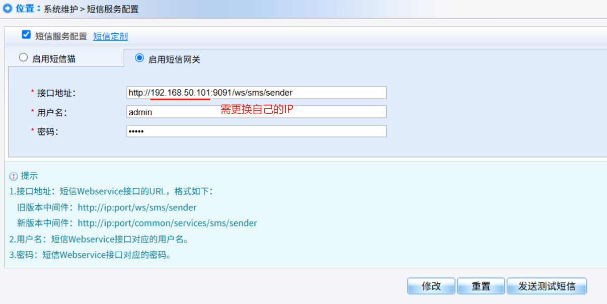 5、打开SMP后台,再“系统维护 -> 短信服务配置”中,勾选“短信服务配置”,并选择“启用短信网关”选项,参数配置如下: