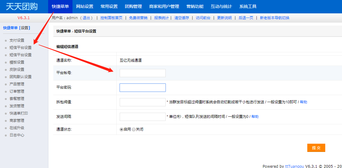 - 第四部:进入后台,刷新缓存,选择网站设置->短信平台设置,选择互亿无线,设置里面填写互亿无线账户名和密码即可 .