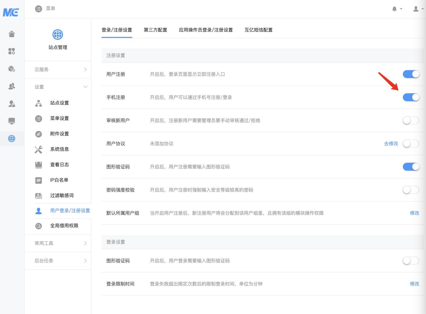 进入“登录/注册设置”页面,将页面中“手机注册”选项设置为“开启”。