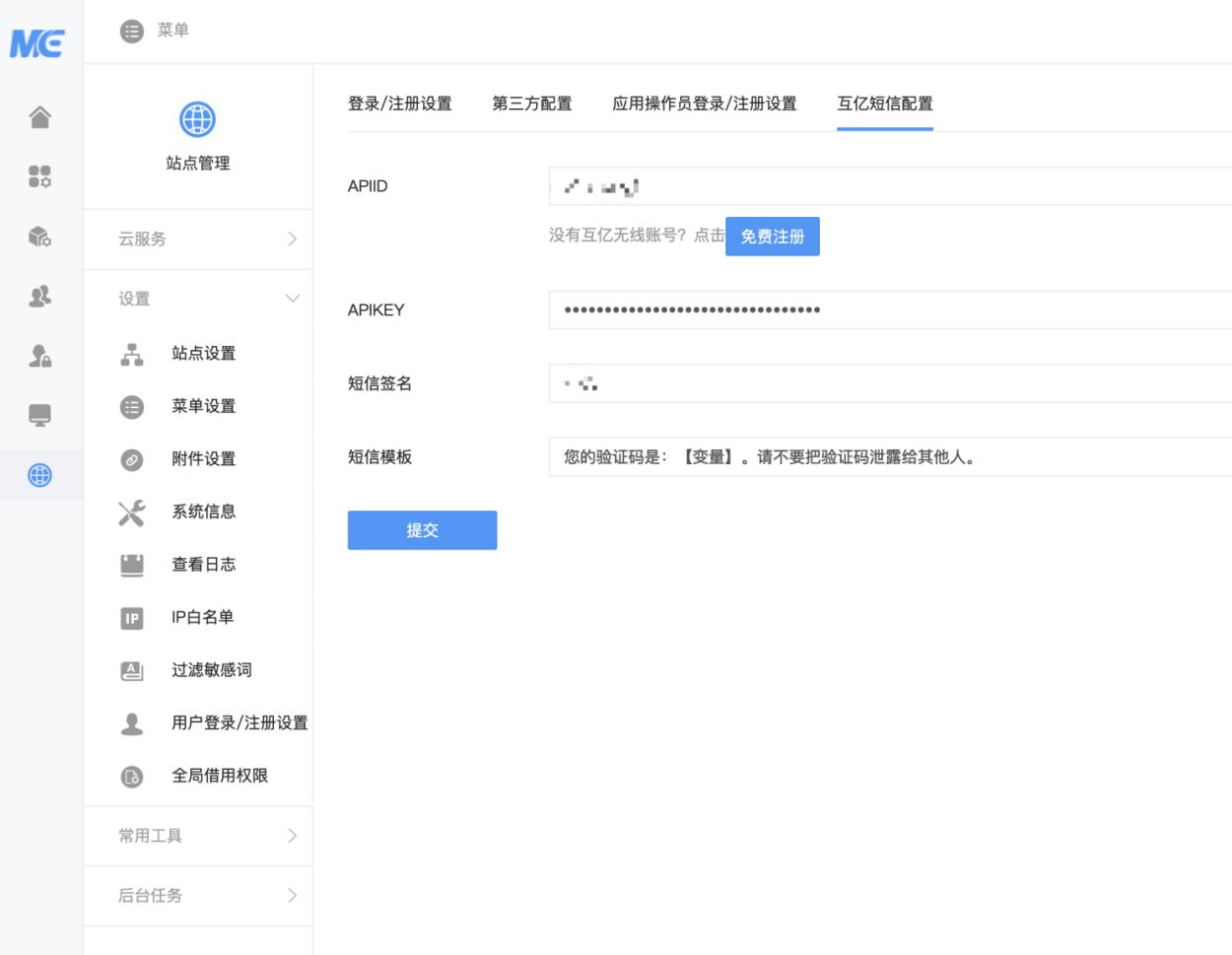 点击顶部标签“互亿短信配置”,在页面中依次填写“互亿APIID”、“互亿APIKEY”、“短信签名”及“短信模板”,点击“提交”按钮完成短信设置。