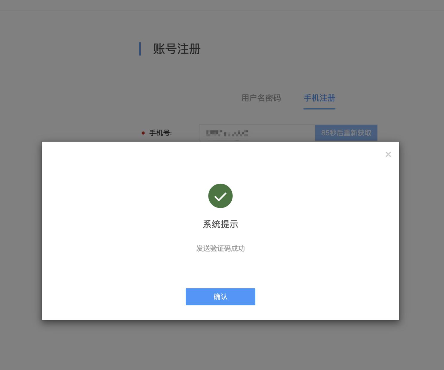 配置成功后,可登录微擎用户注册页,选择“手机注册”,填写手机号码并获取短信验证码。