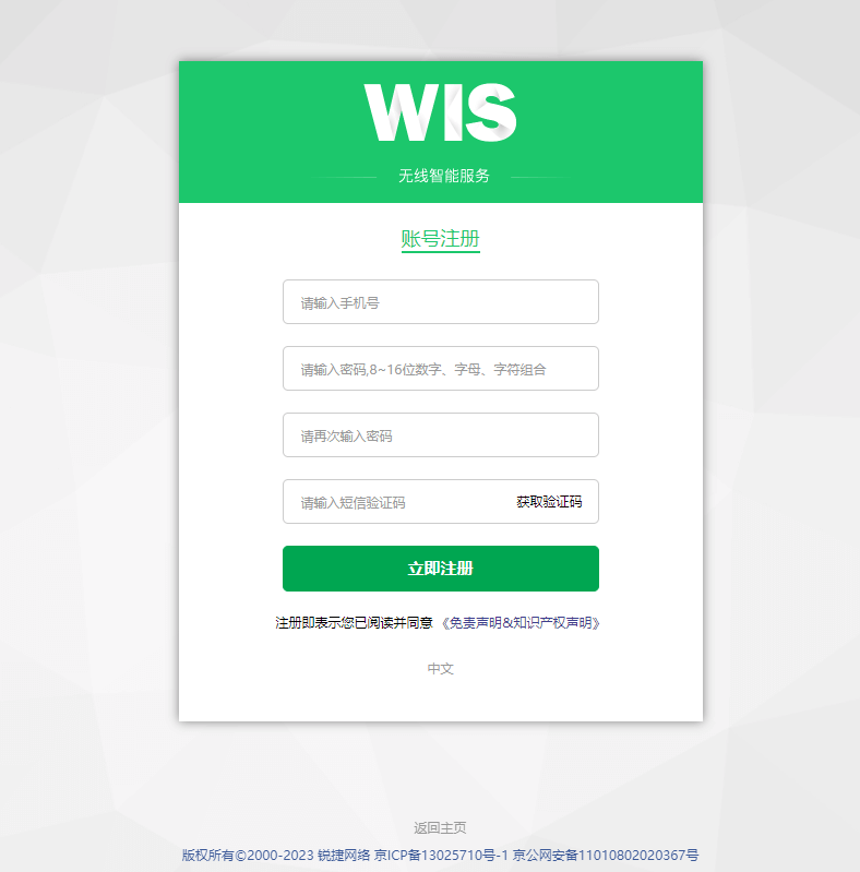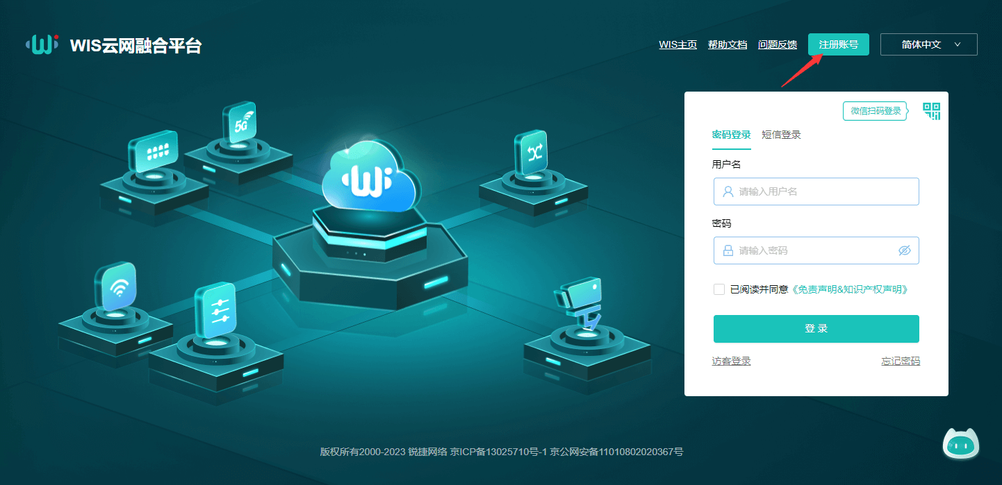 如果您还没有WIS 5.0云管平台的账号,可以点击右上角的【注册账号】按钮。