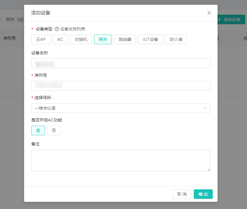 在弹出的窗口中,选择设备类型、场所,填写设备名称、序列号信息后,点击【确定】按钮。