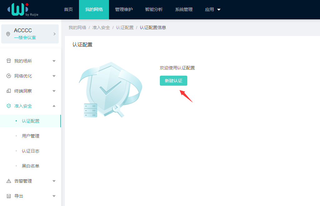 点击左侧菜单“准入安全 -> 认证配置”。在右侧场所列表中,点击需要配置的场所名称。