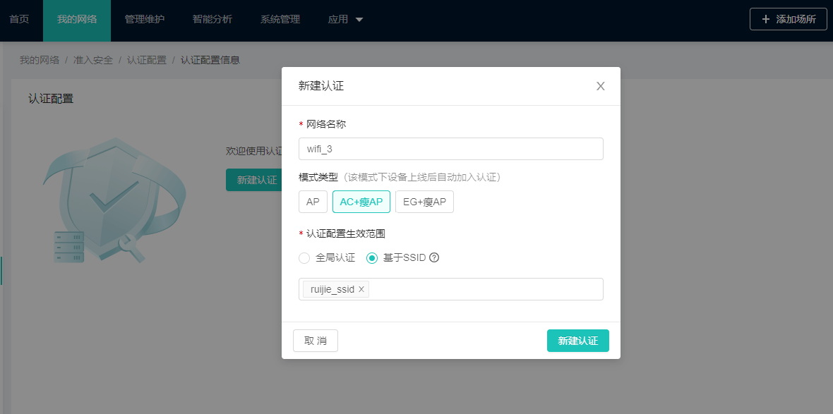 认证配置生效范围:配置全局认证和基于SSID认证(注:一个场所下只允许存在一个全局认证。)