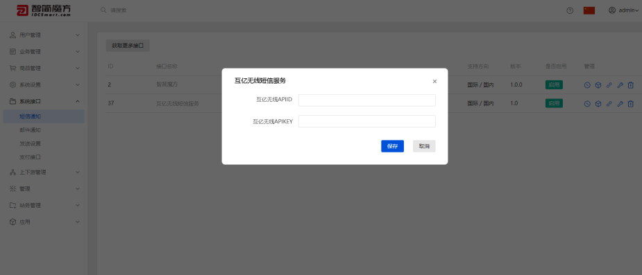 2、进入系统后台→系统接口→短信通知→互亿无线→配置,准确填写互亿无线的相关配置信息,填写完成后点击保存按钮生效。