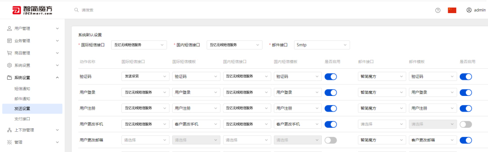 4、进入系统后台→设置→发送设置,找到短信通知渠道选项,将其改为互亿无线短信。