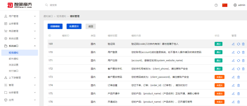 3、进入系统后台→系统接口→短信通知→互亿无线→模板管理,根据实际业务需求完成短信模板的设置操作。