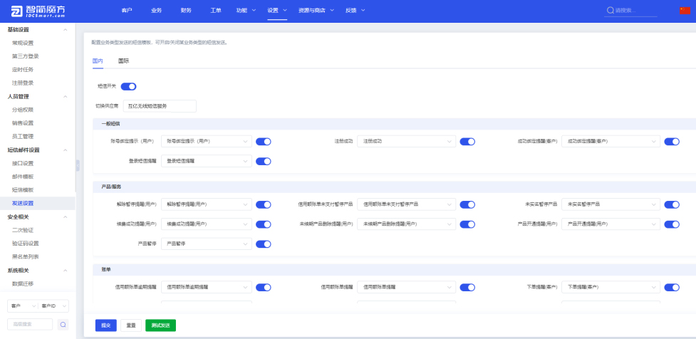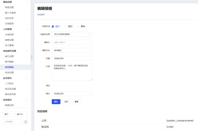 3、进入系统后台→设置→系统设置→发送设置→配置,根据业务需求完成短信模板的设置操作。