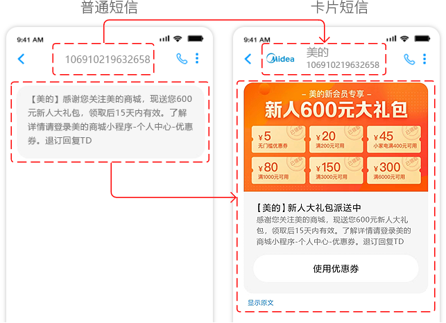 卡片短信能直接把普通短信解析成图片/视频/文字/交互按钮等富媒体消息,交互形式支持唤醒 APP、跳转 H5 页面、一键拨号等功能,且应用手机短信原生入口,无需下载/注册/关注,精准推送,一键直达。