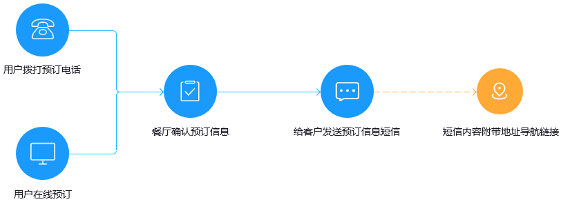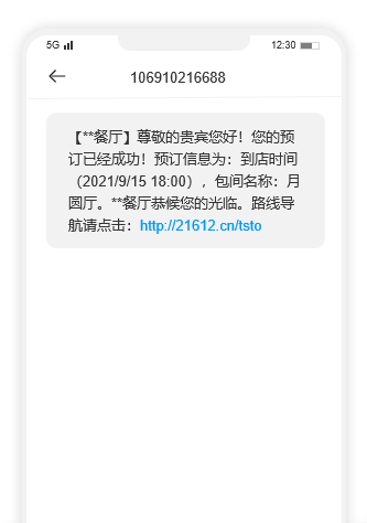 用户通过电话、小程序预订座位或包厢后,系统自动给用户发送预订信息短信,可以给客户予以提醒及二次确认,提升用户体验,减少差错率。
